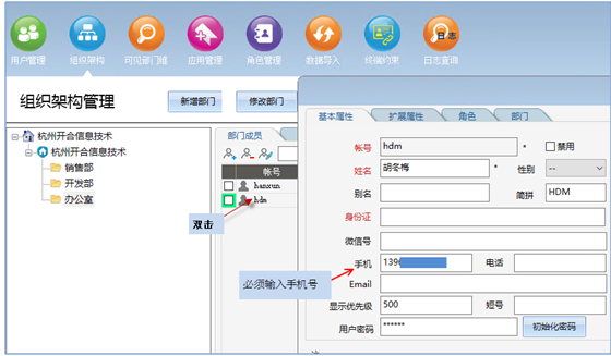 人員維護(hù)的時(shí)候,需要給賬號(hào)設(shè)置其手機(jī)號(hào)碼,該手機(jī)號(hào)碼與企業(yè)微信里面設(shè)置的手機(jī)號(hào)碼要求一樣。這個(gè)設(shè)置是為了解決Gungho系統(tǒng)與企業(yè)微信的單點(diǎn)需求