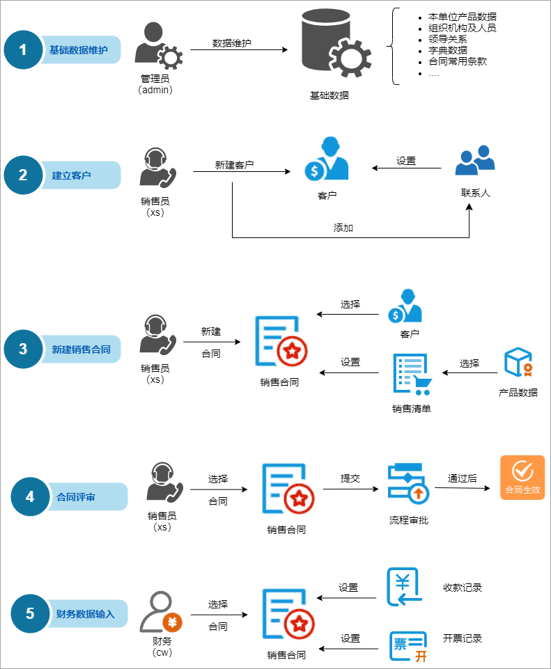 合同軟件涉及的企業(yè)員工角色:銷售、采購、管理員、主管、財務(wù)。以下是各個角色主要需要做的事情。