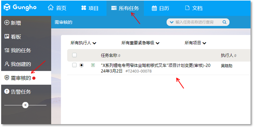 相關(guān)人收到審批需求的時(shí)候,會(huì)在審批人的“需審批的”任務(wù)里面列出