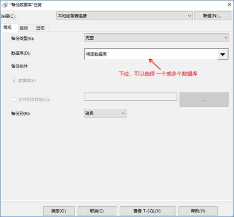 4、在彈出窗口中,先選擇“備份類(lèi)型”(完整/差異/事務(wù)日志),然后選擇您要備份的具體一個(gè)或多個(gè)數(shù)據(jù)庫(kù)。如您所見(jiàn),您可以選擇備份所有數(shù)據(jù)庫(kù)、系統(tǒng)數(shù)據(jù)庫(kù)、用戶(hù)數(shù)據(jù)庫(kù)和特定數(shù)據(jù)庫(kù)。之后再選擇一個(gè)用于存放此備份的目標(biāo)路徑,點(diǎn)擊“確定”