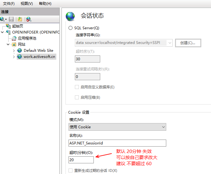 設(shè)置IIS的session (失效)過期時間(登陸后較長時間登錄有效) 2025/01/20 分類:產(chǎn)品中心 產(chǎn)品手冊 523 Mobox實施工程師希望,“mobox2一段時間不動,就需要刷新頁面,這個時間可以延長嗎,比如說頁面半個小時候沒人動,才需要刷新” 。這個需要設(shè)置設(shè)置下IIS的session 過期時間來實現(xiàn) 解決方法 1、先如Windows 的 iis 管理器 2、選擇所需要配置的網(wǎng)站 進(jìn)行調(diào)整 3、修改登錄有效時間 標(biāo)簽:手冊 上一篇: mobox3 格式化日期 下一篇: mobox預(yù)警管理平臺